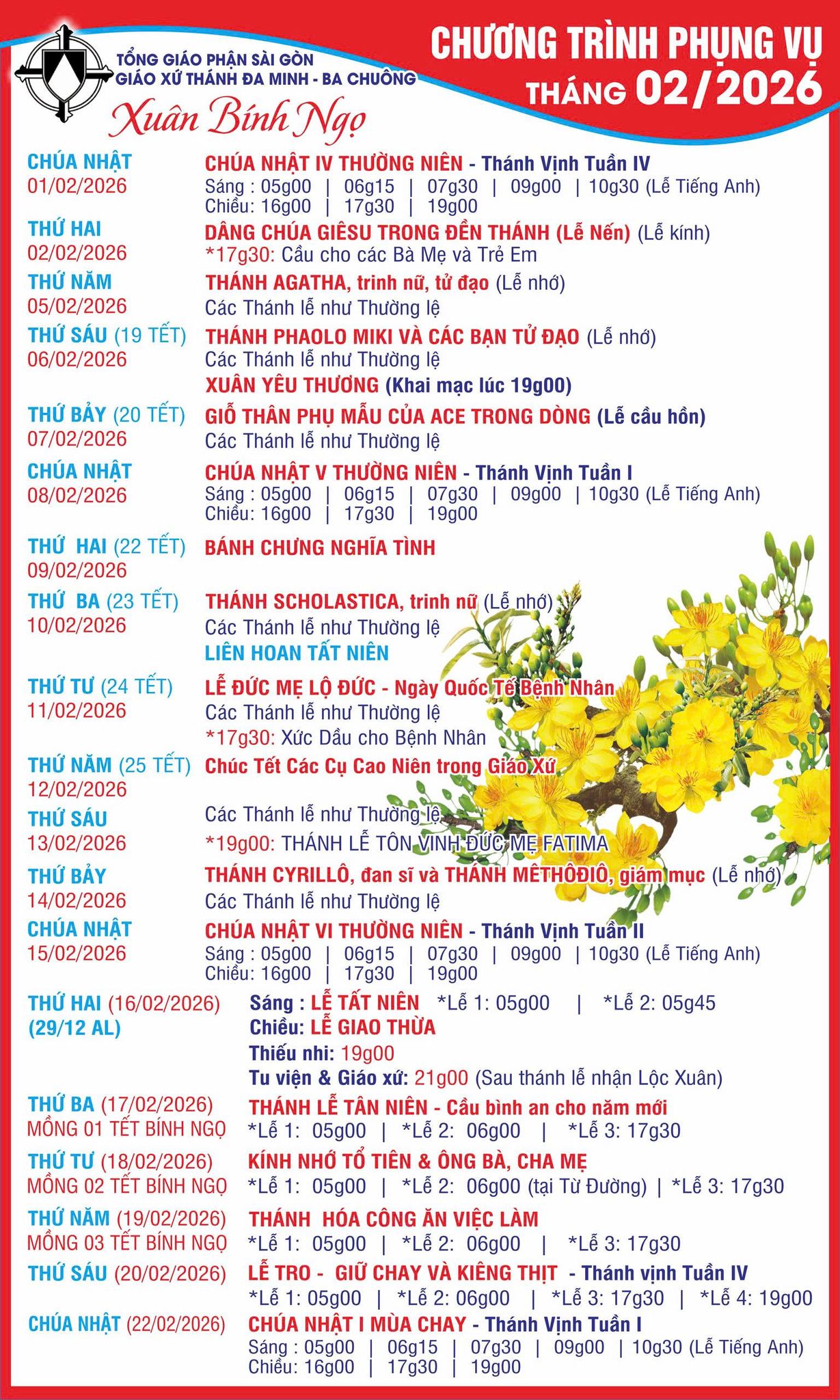 LỄ TRO (Mồng 4 tết, 20/02): 05:00, 06:00, 17:30, 19:00