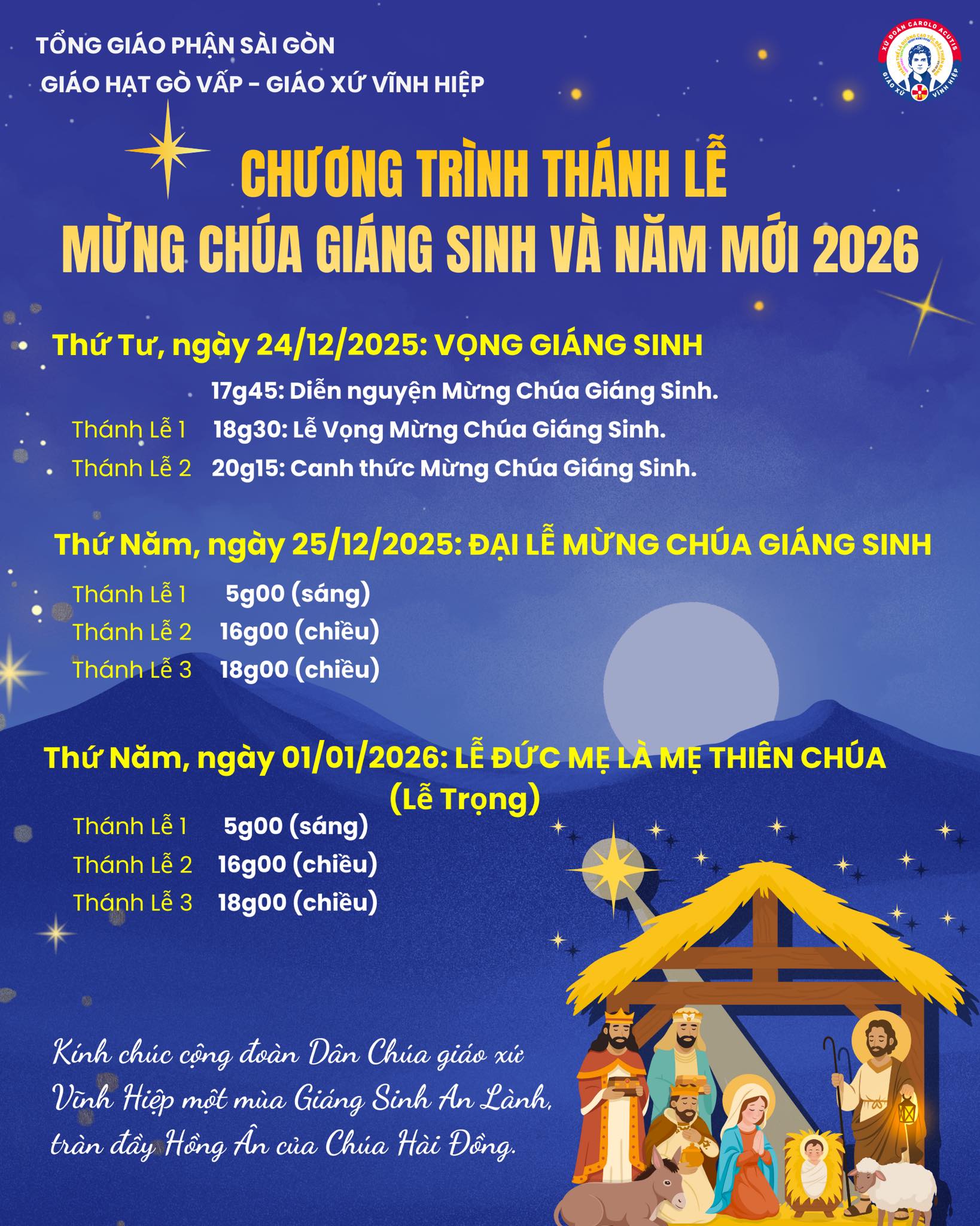 • Lễ Giáng Sinh (25/12) 05:00, 16:00, 18:00